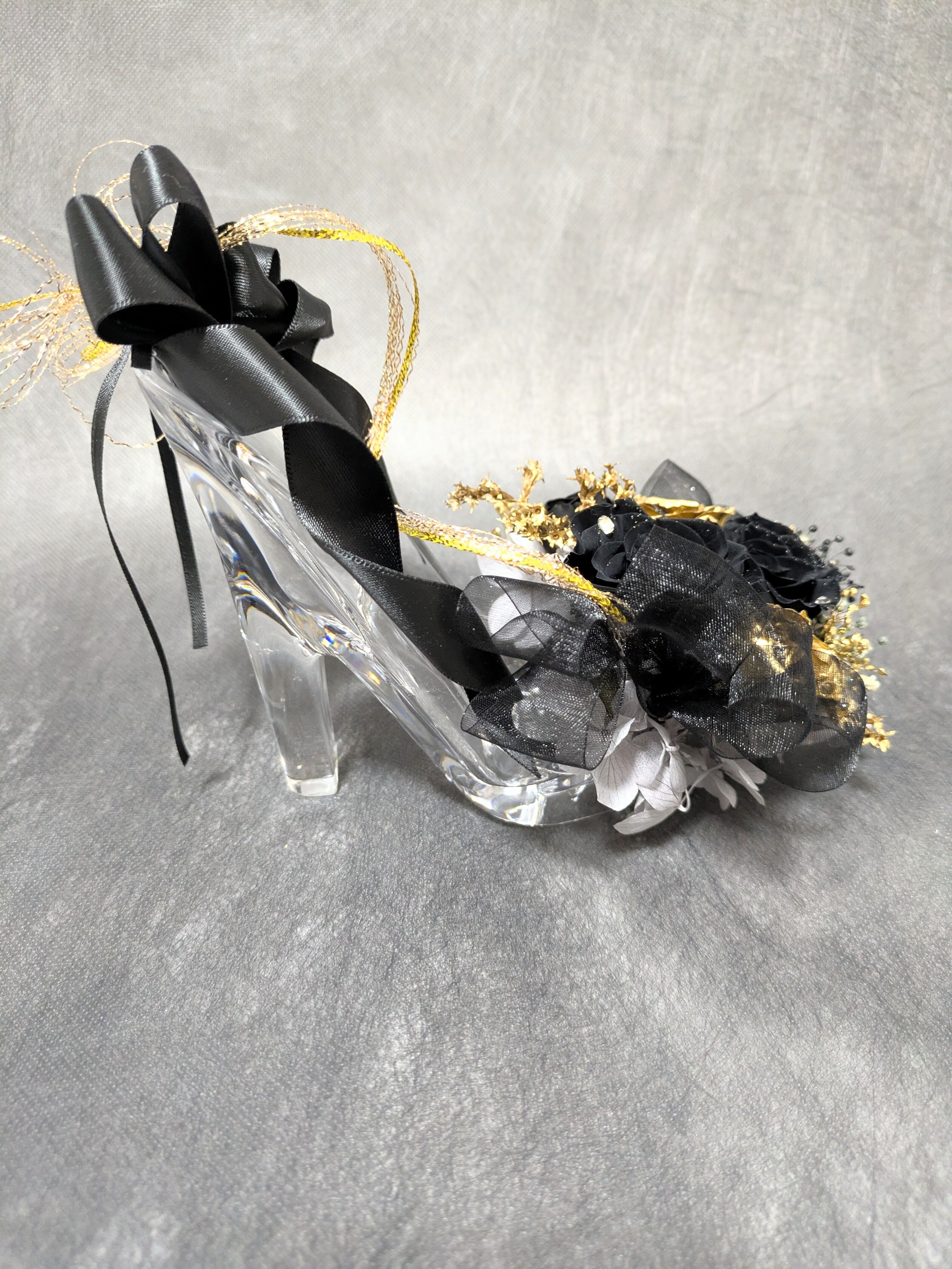 黒薔薇とゴールドローズとリボンのガラスの靴アレンジ。
