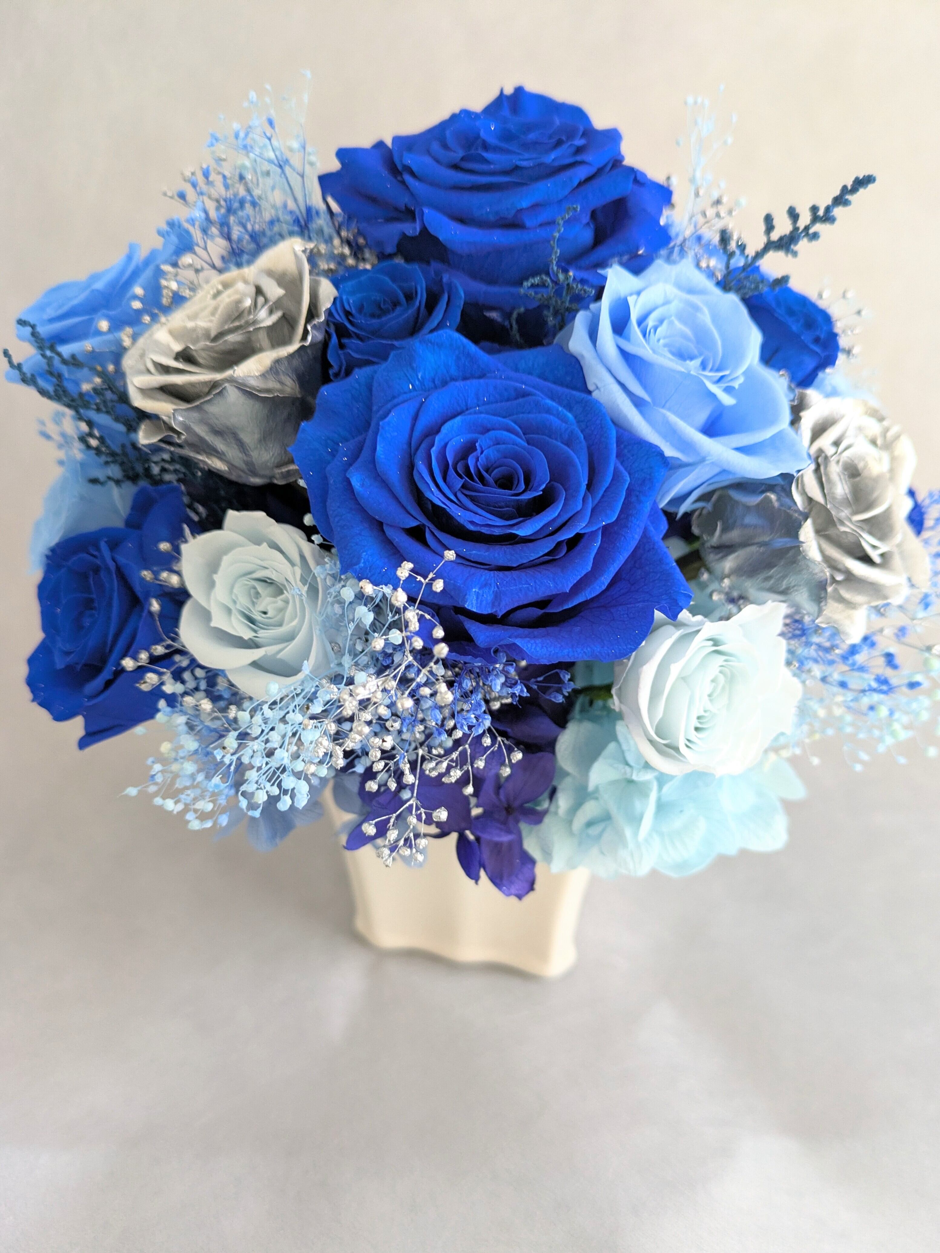 プリザーブドフラワーを白い陶器の花器に青い薔薇とブルー系の薔薇、シルバーローズ、かすみ草などでボリューム感のある豪華なアレンジに仕上げました。