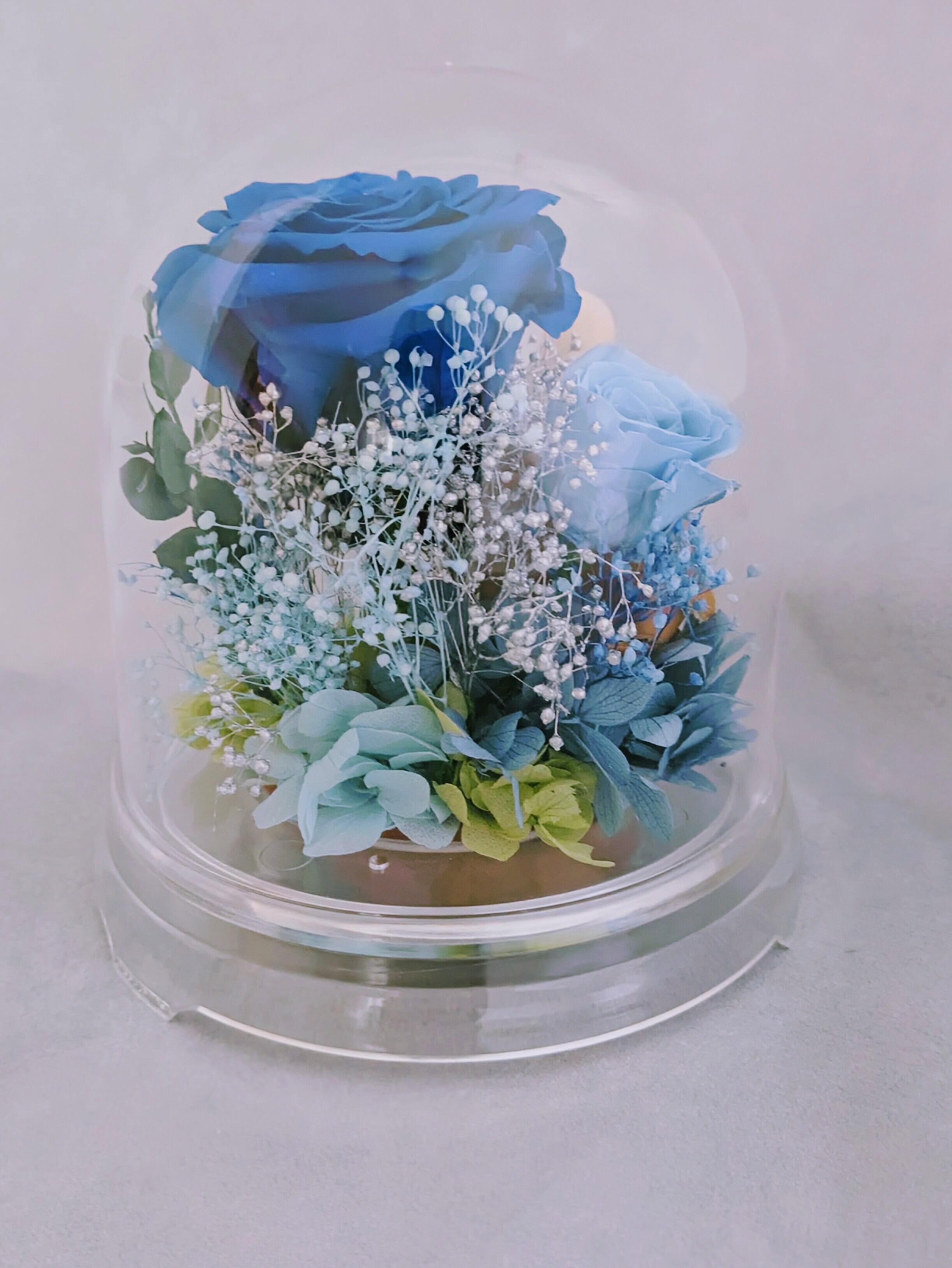 透明なドームの中に青とブルーの薔薇や小花を使用し、ミニチュアの野球バットやグローブ、ボールなどを装飾した野球アレンジです。