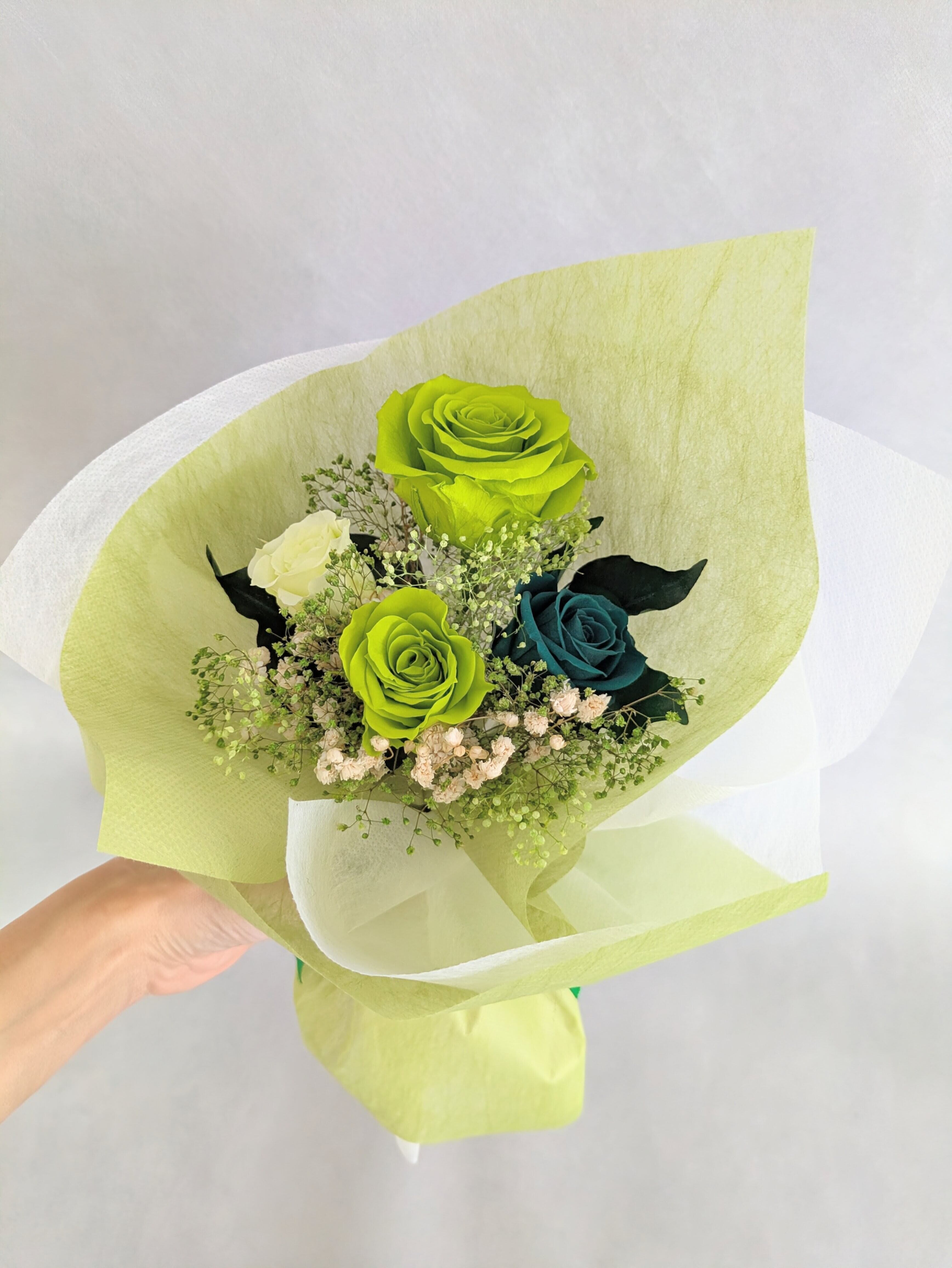 大輪グリーンローズと3色の薔薇とかすみ草のふんわり花束(プリザーブドフラワー)