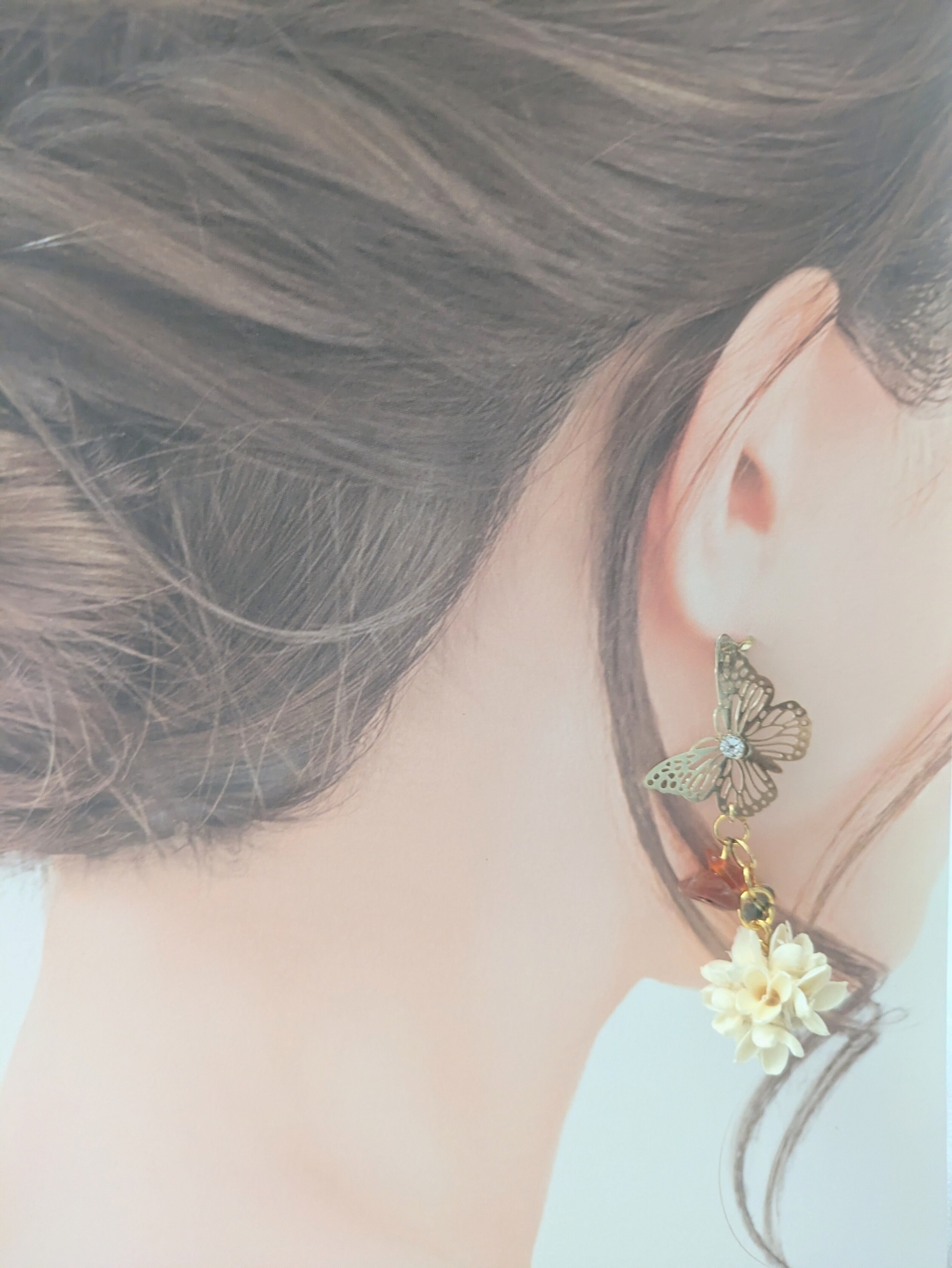 自然素材アクセサリー/木の実と蝶々のピアス/イヤリングに変更可金属アレルギー対応(天然素材アクセサリー両耳用)