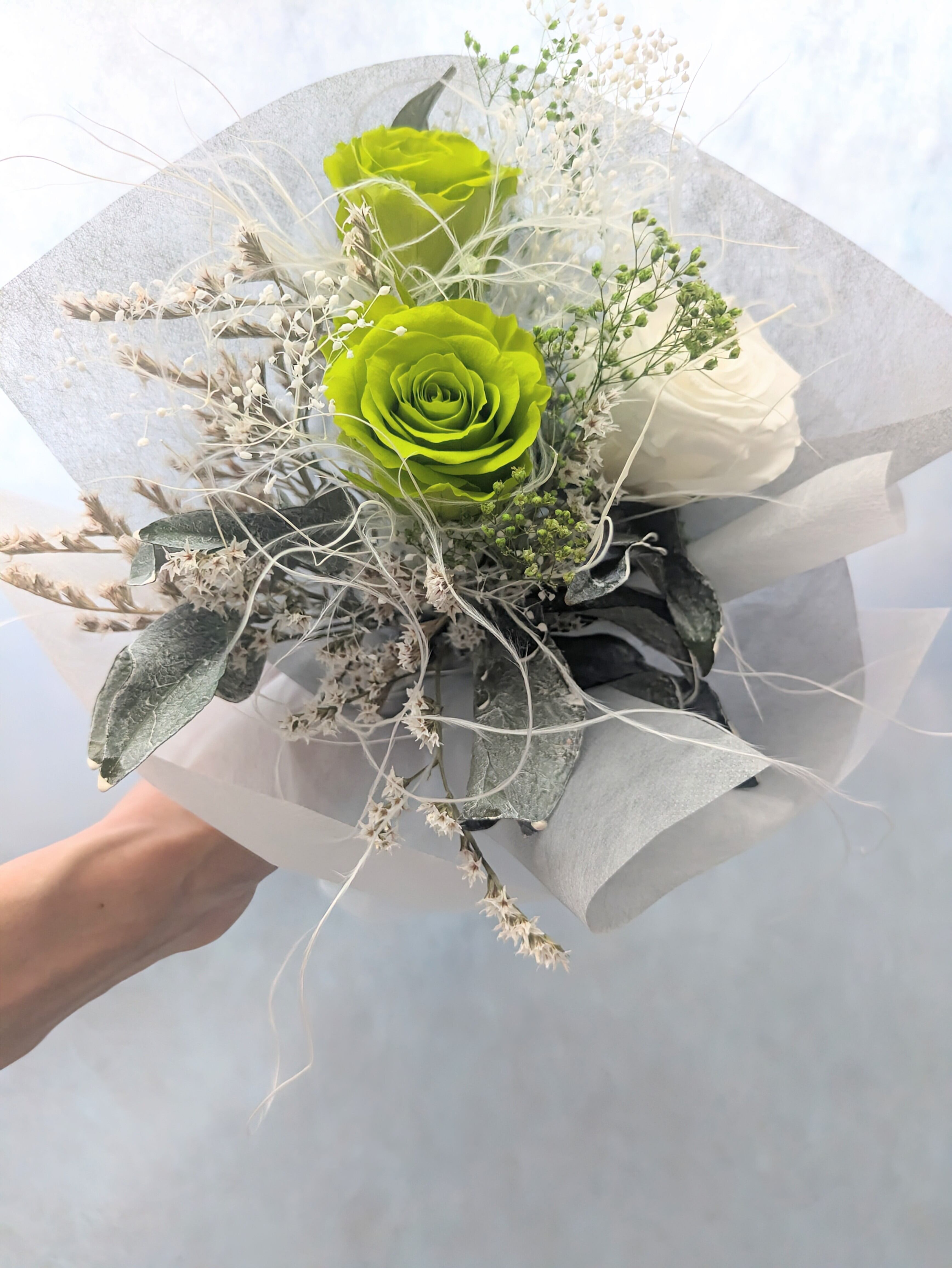 プリザーブドフラワー/大輪ホワイトグリーンローズと小花の花束柔らかな風/花束ラッピング