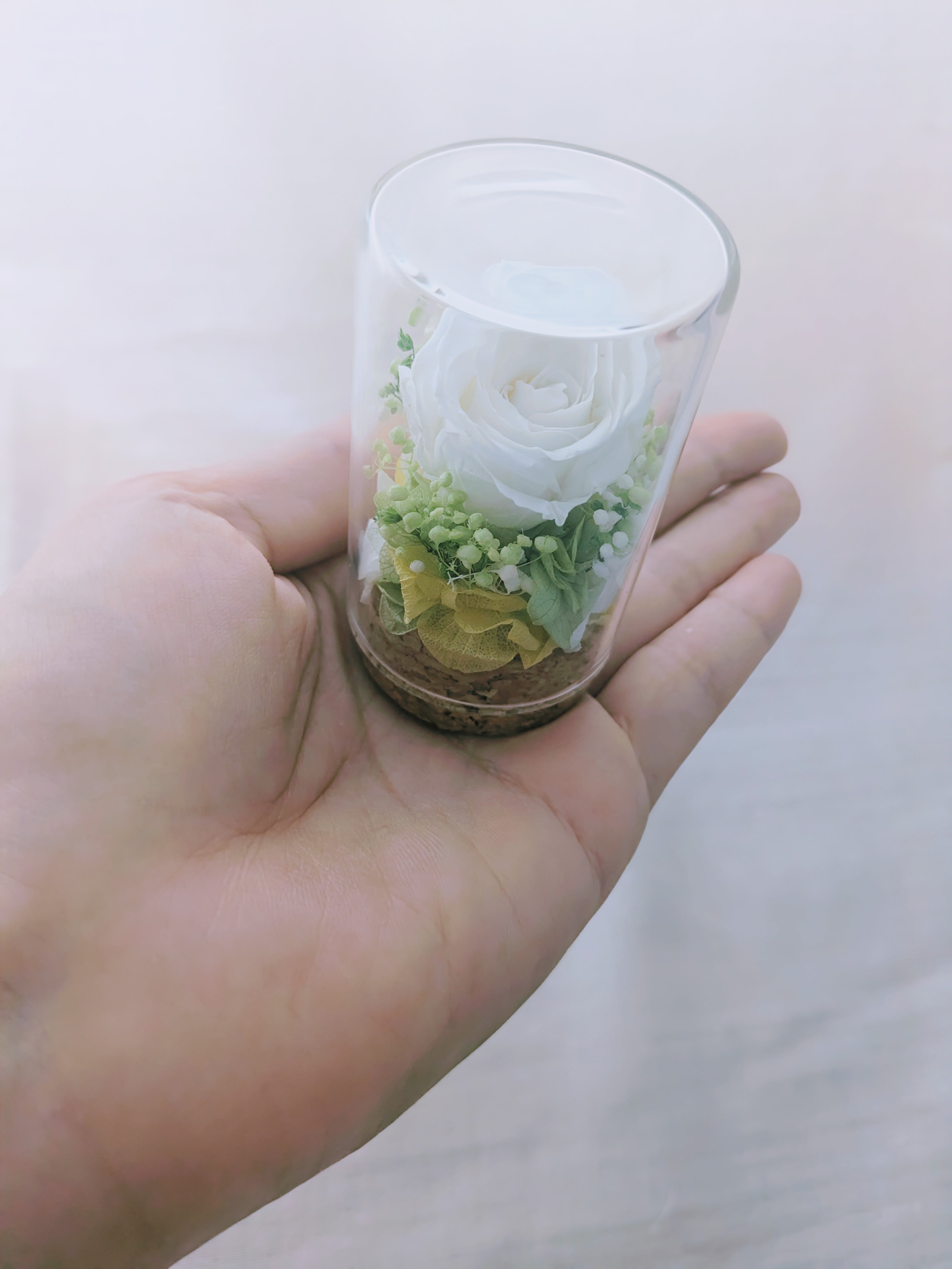 プリザーブドフラワー/ 白いミニ薔薇と小花のミニガラスボトルギフト