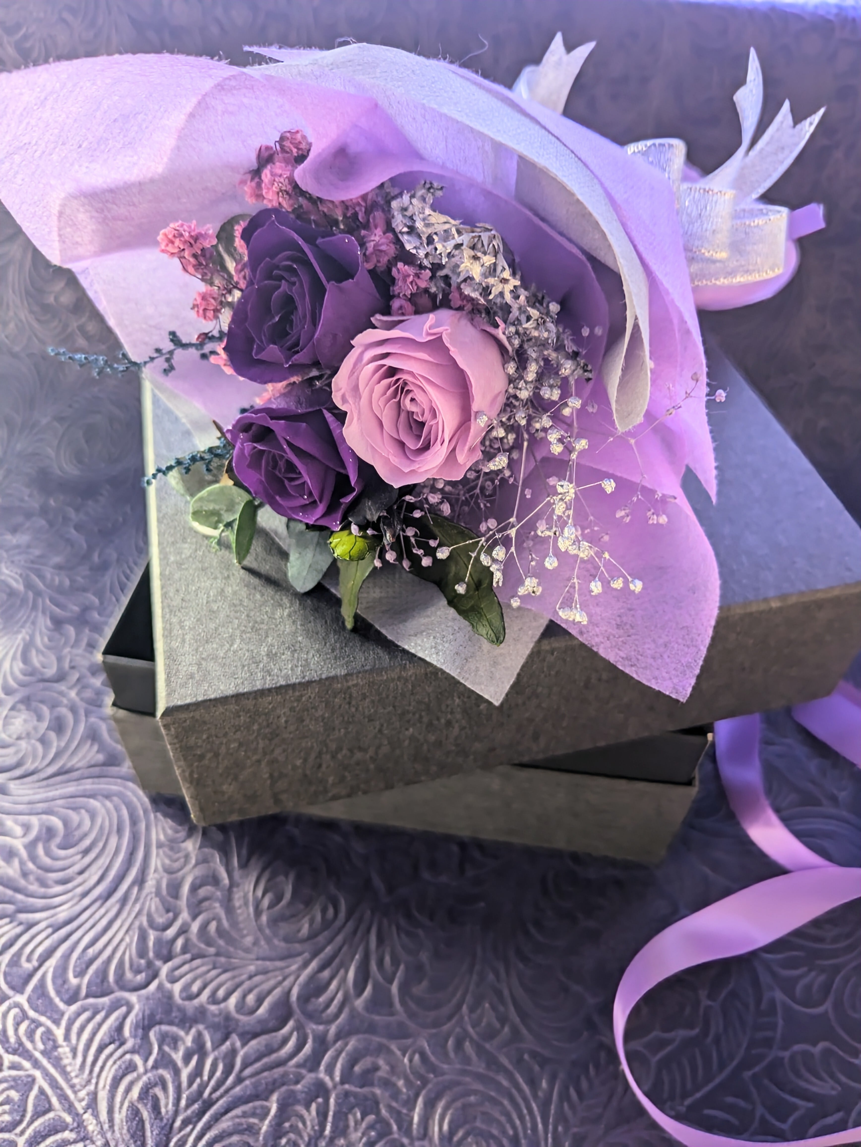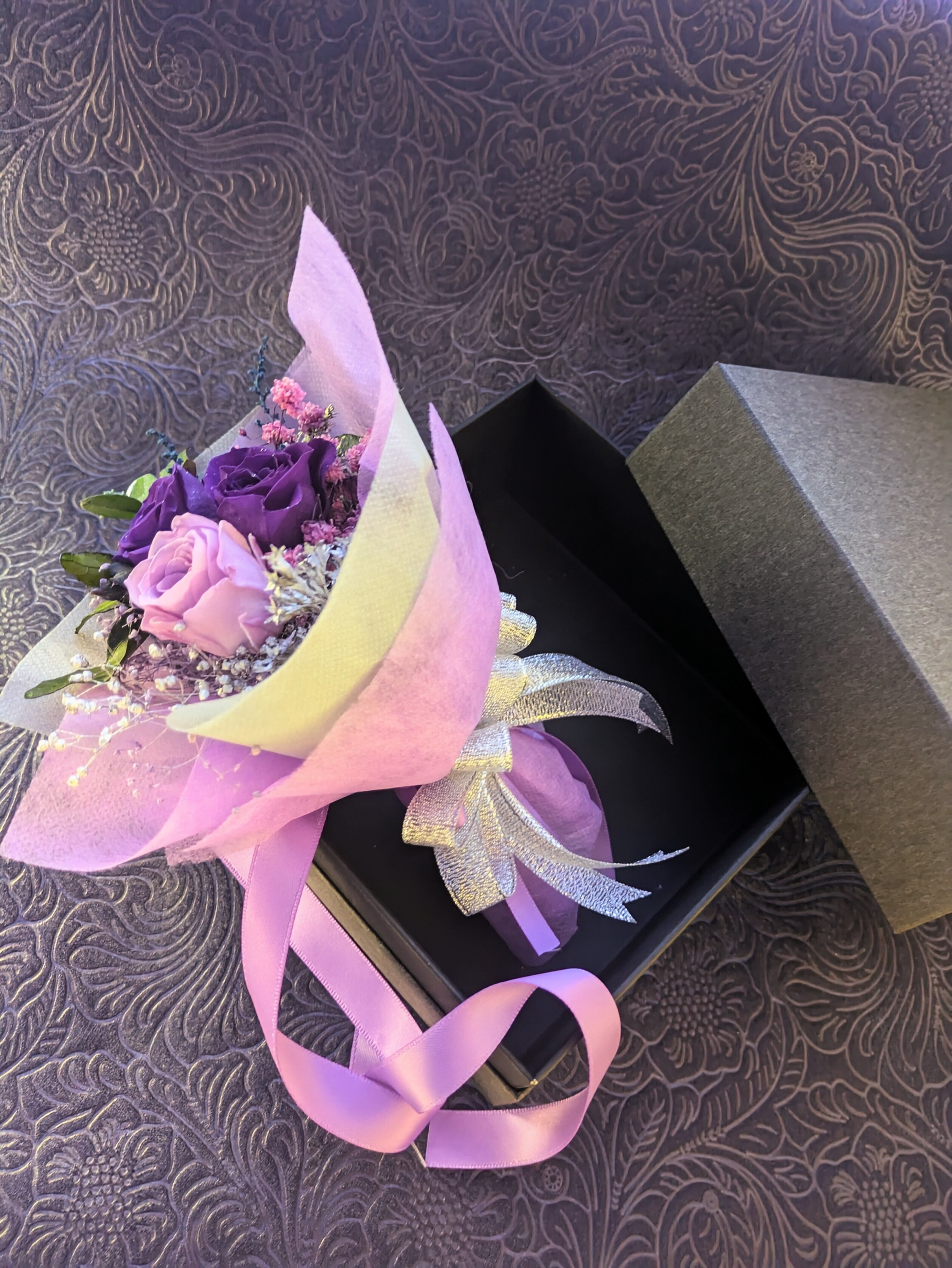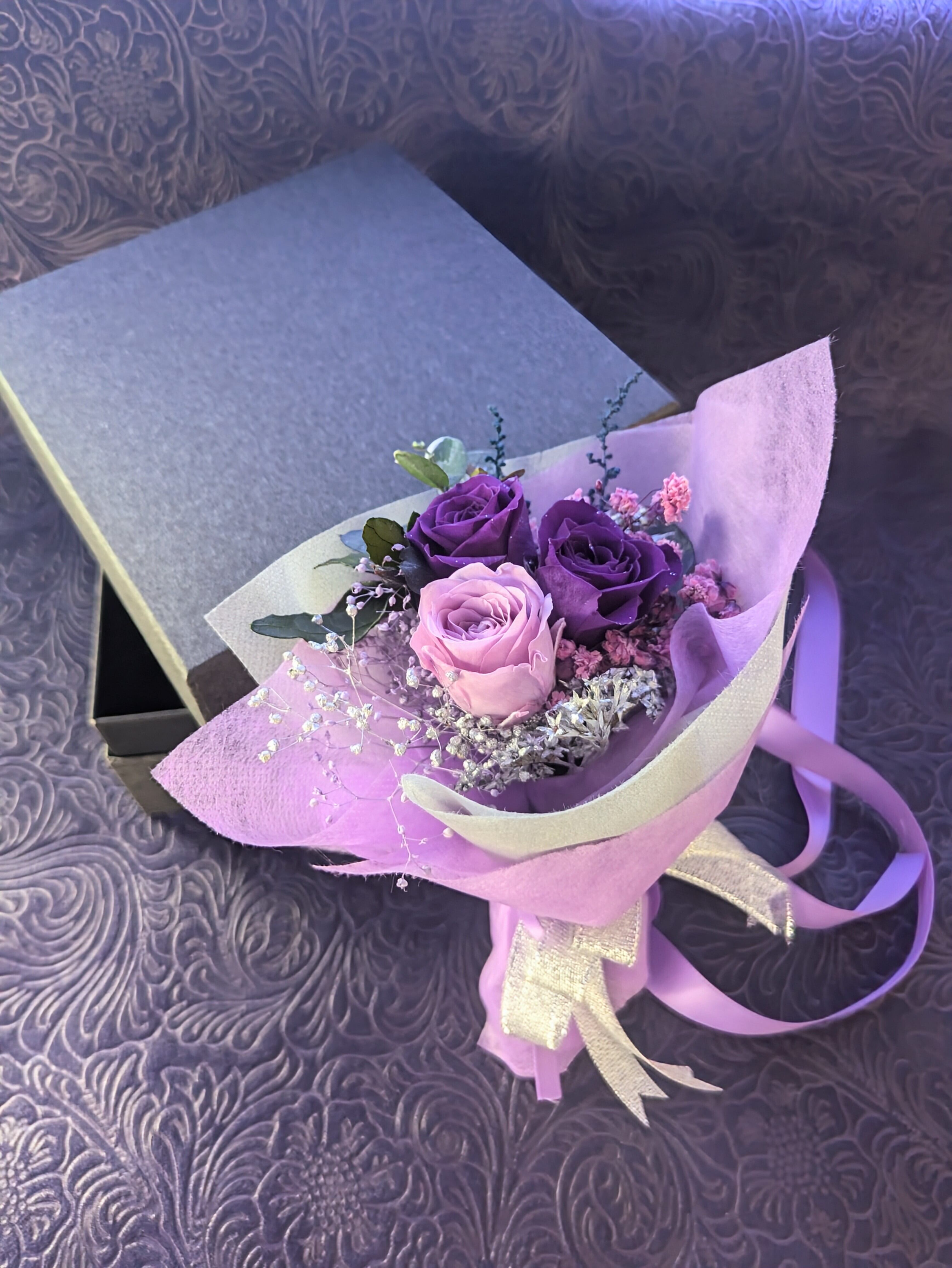 プリザーブドフラワーの紫のミニ薔薇と小花やグリーンを少しずつ使用したミニ花束です。黒いギフトボックスの中に入るミニ花束。少しダーク感と美しさをあわせたデザインです。アニメやファンタジーな世界から出てきたような花束です。