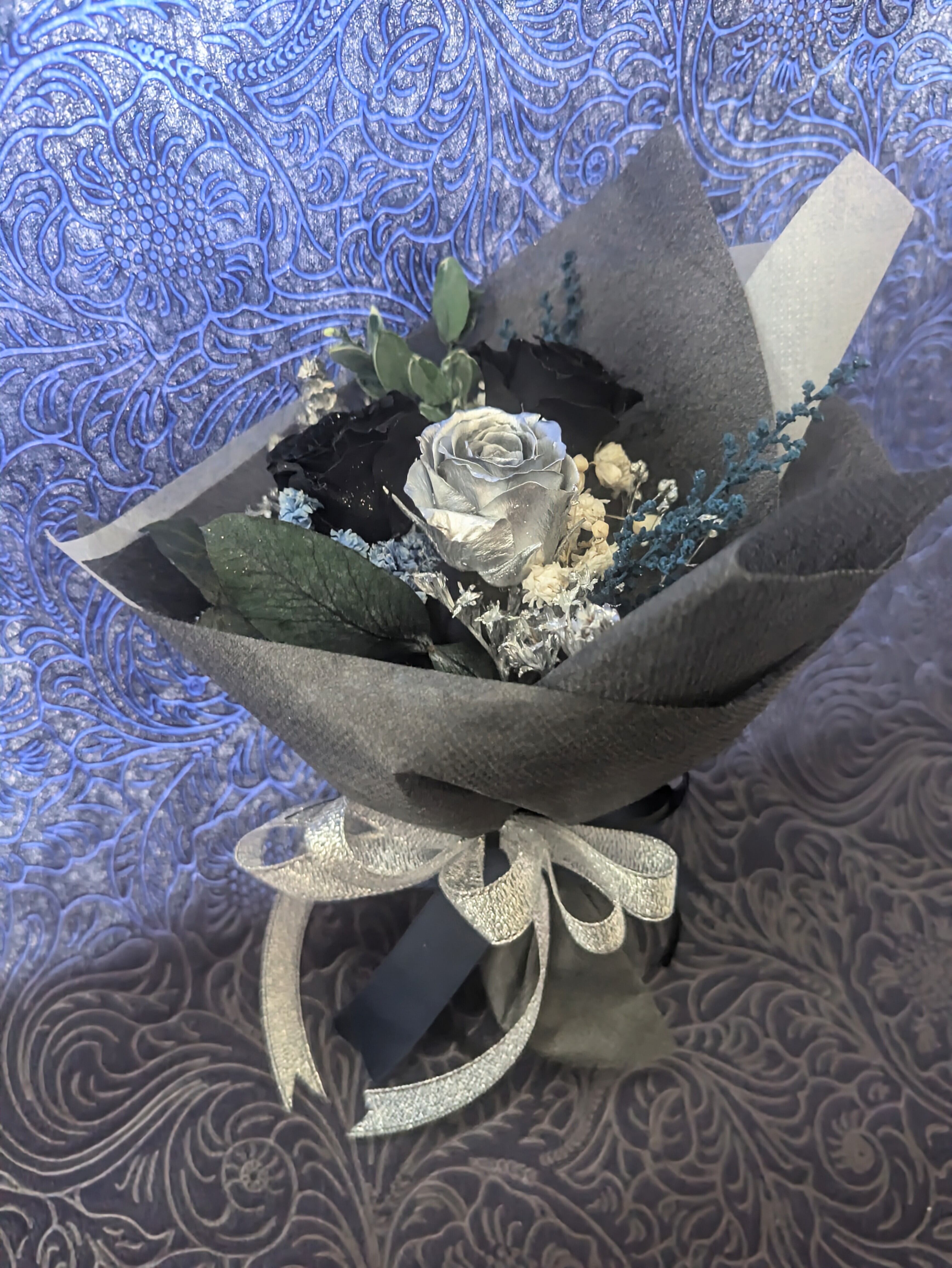 プリザーブドフラワーのミニ黒薔薇とシルバーローズ、小花やグリーンを少しずつ使用したミニ花束です。
