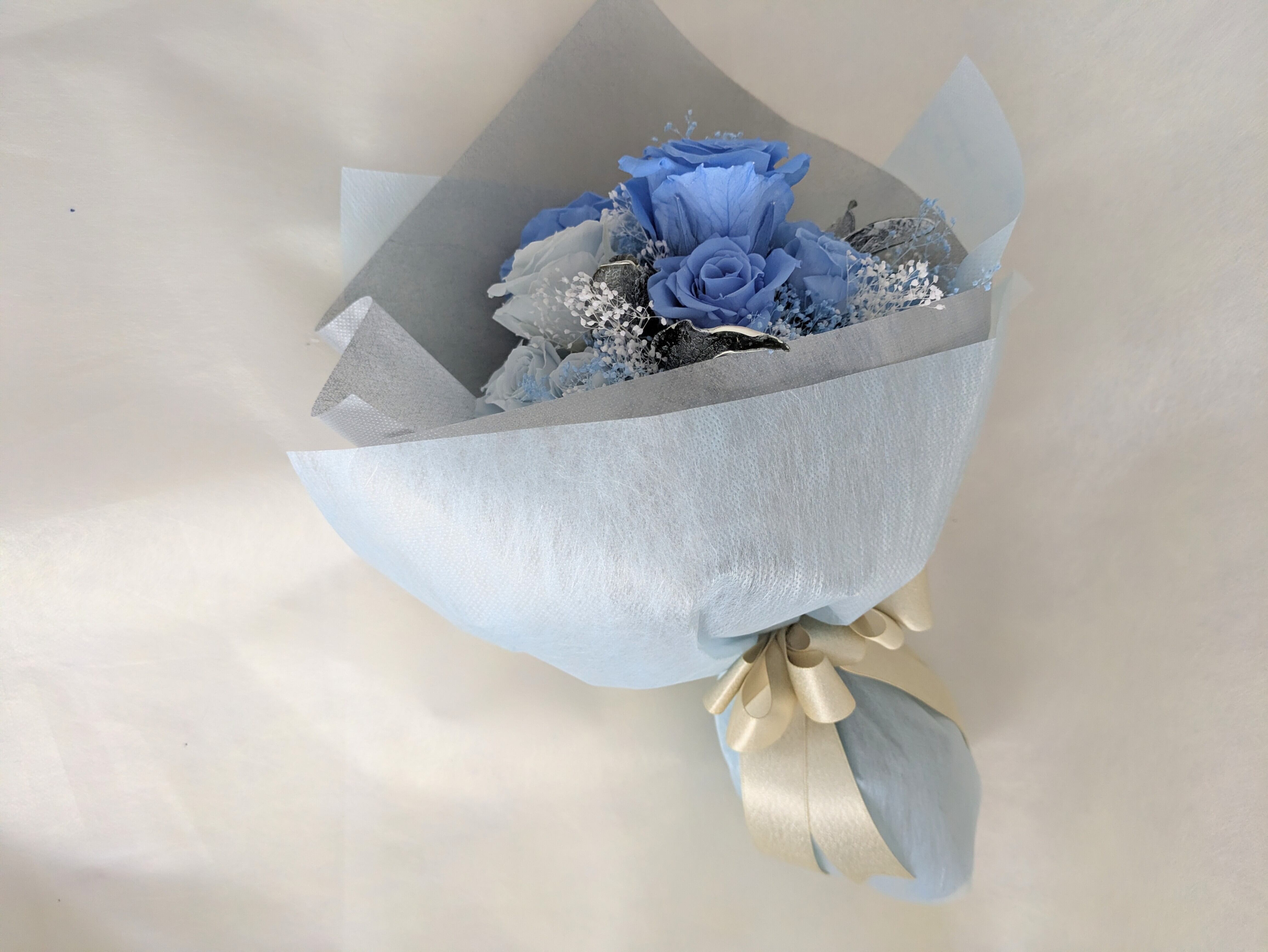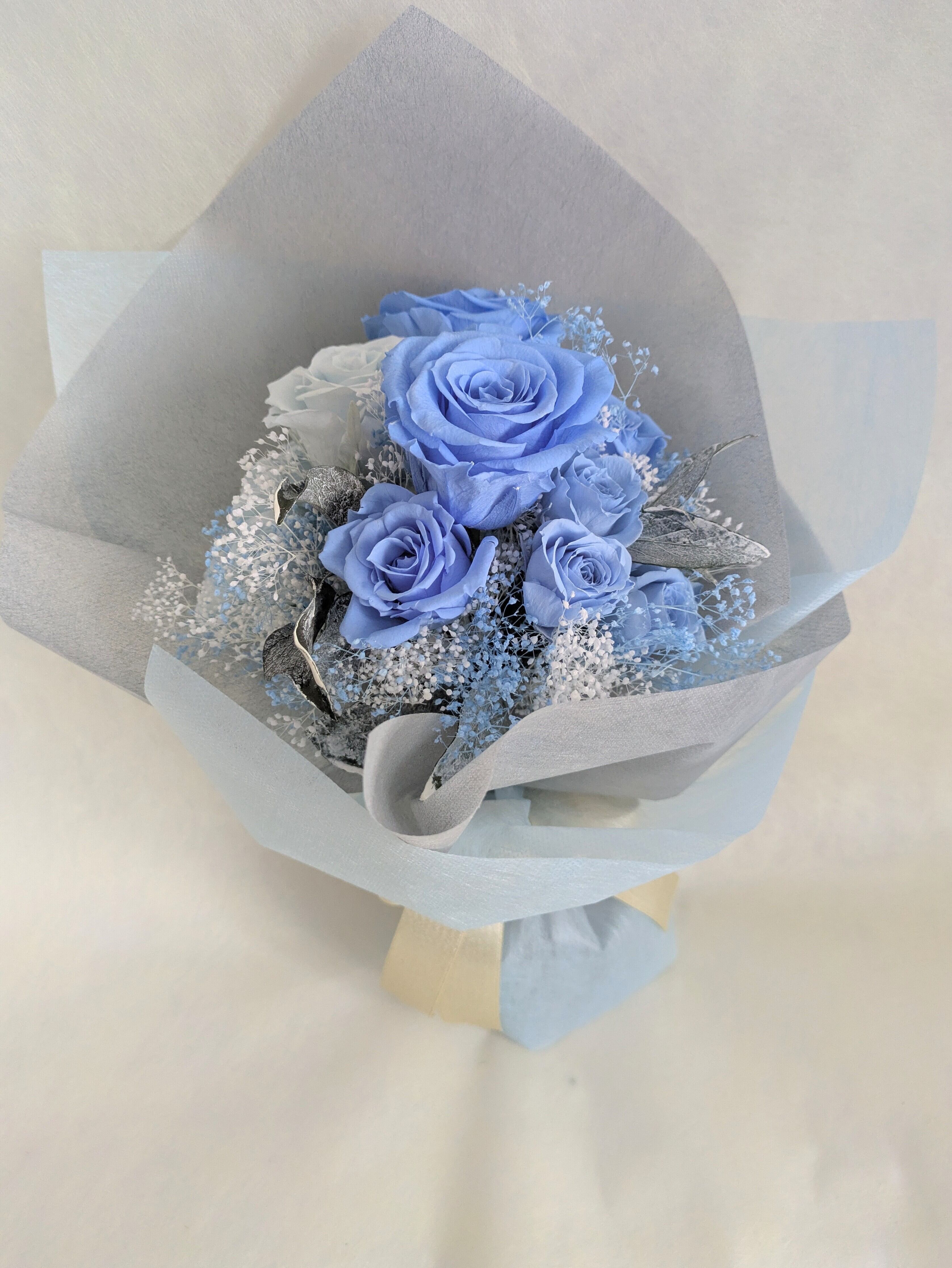 プリザーブドフラワー/空色とベビーブルーローズのふんわりエアリー感漂う花束