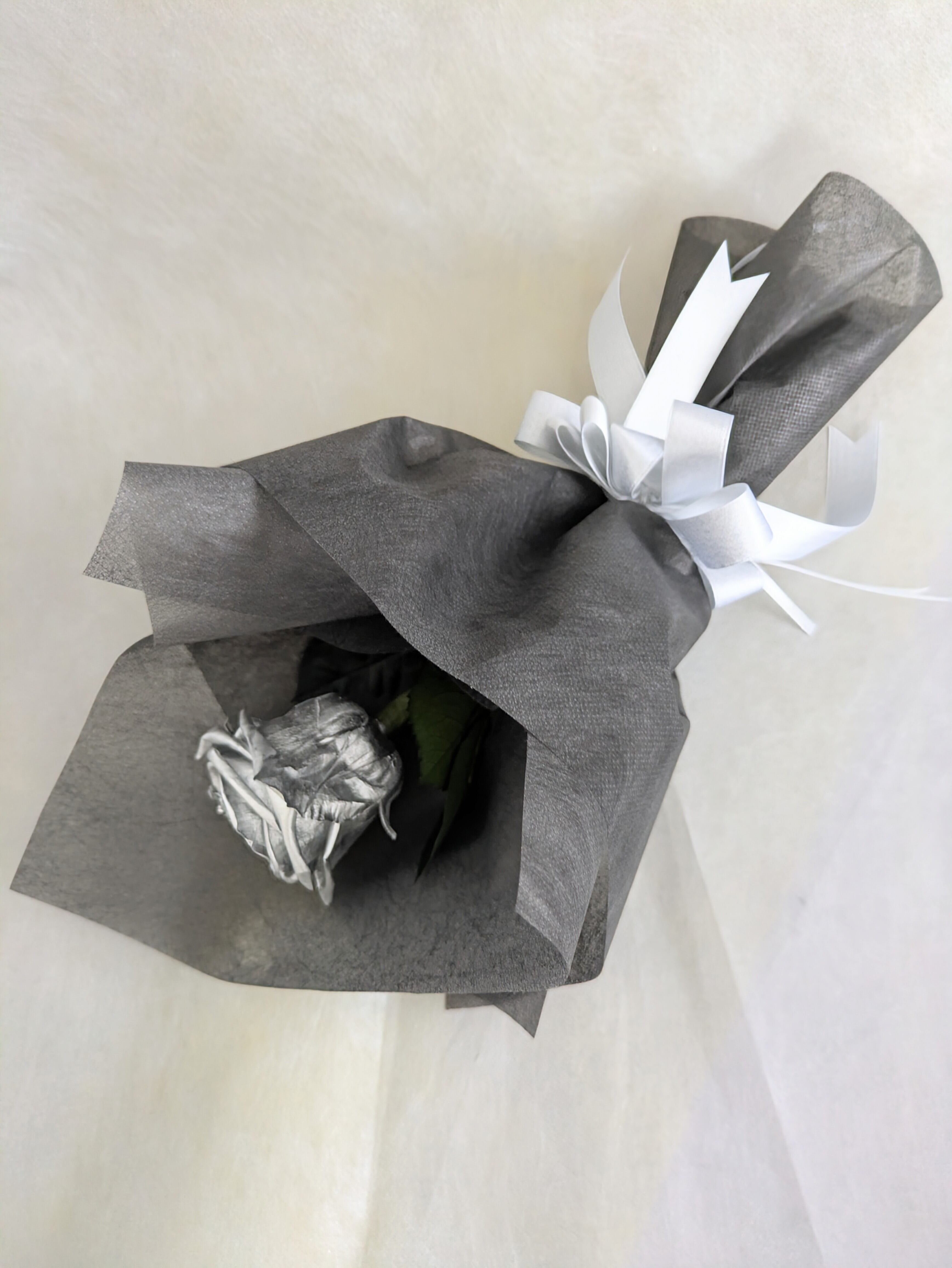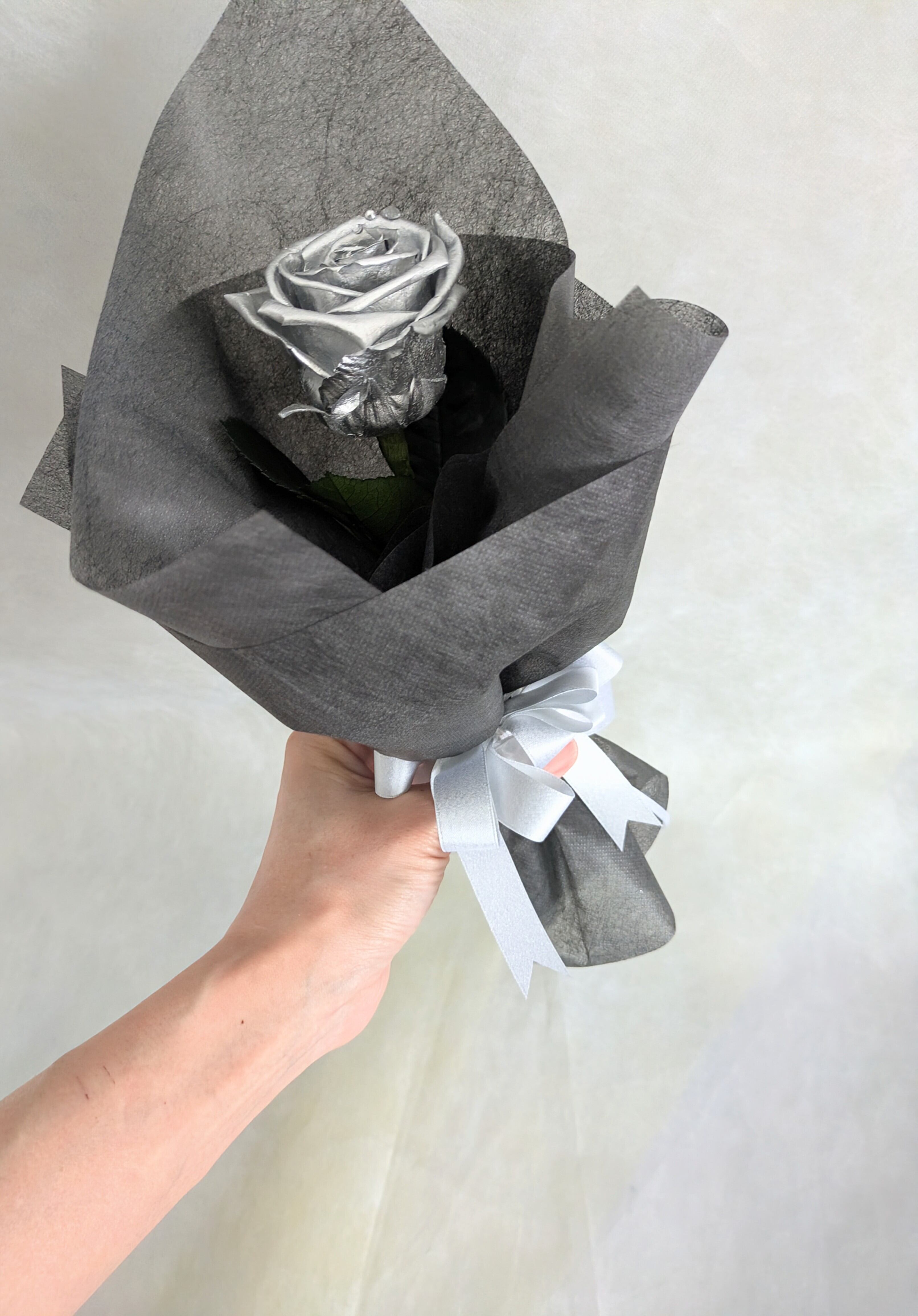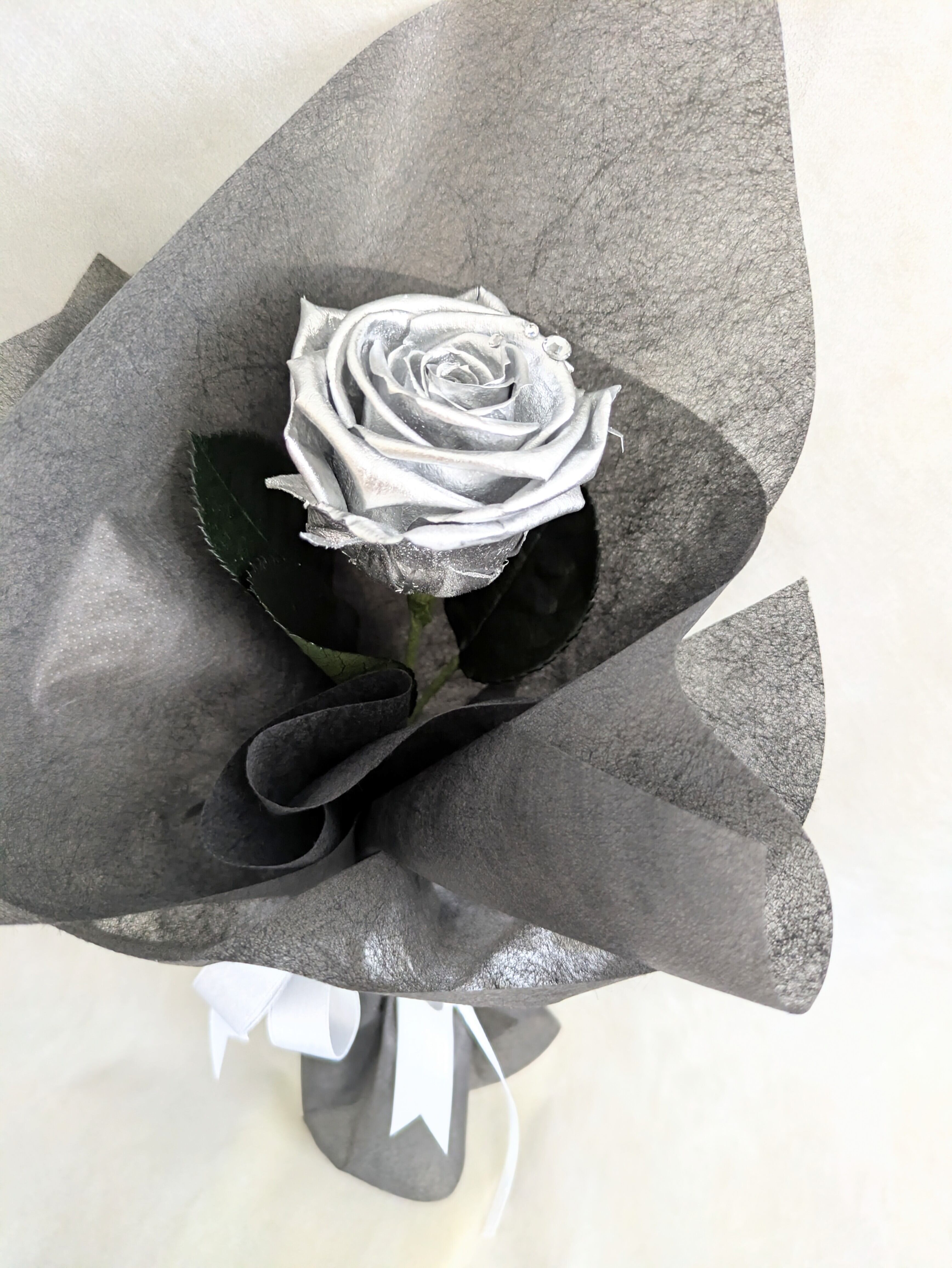 プリザーブドフラワー/大輪シルバーローズ1輪花束☆ダイヤモンドローズキラキララインストーンー付き