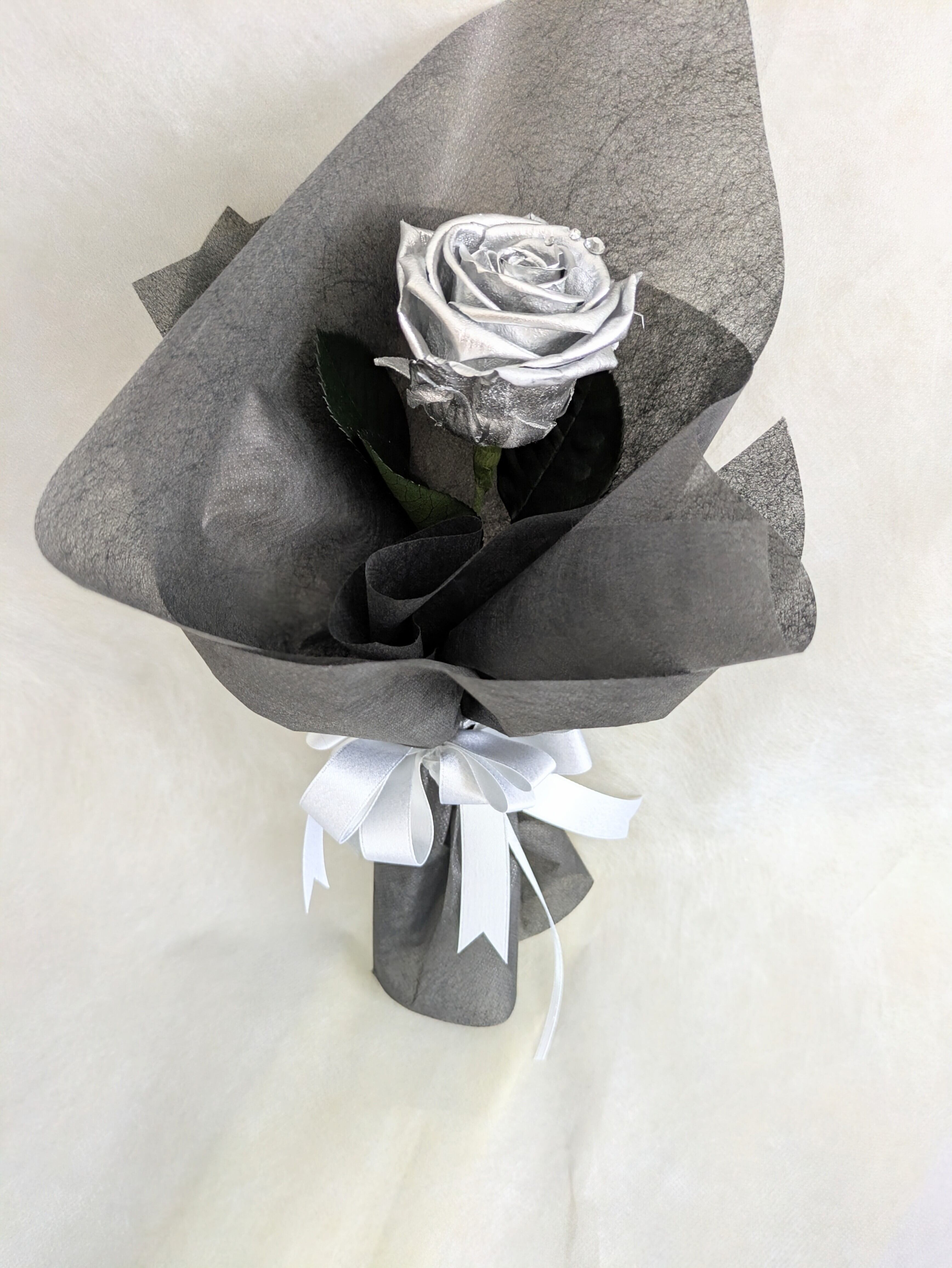 大輪のシルバーローズにキラキラとした雫のようにラインストーンをつけたキラキラとした1輪花束。
